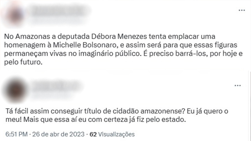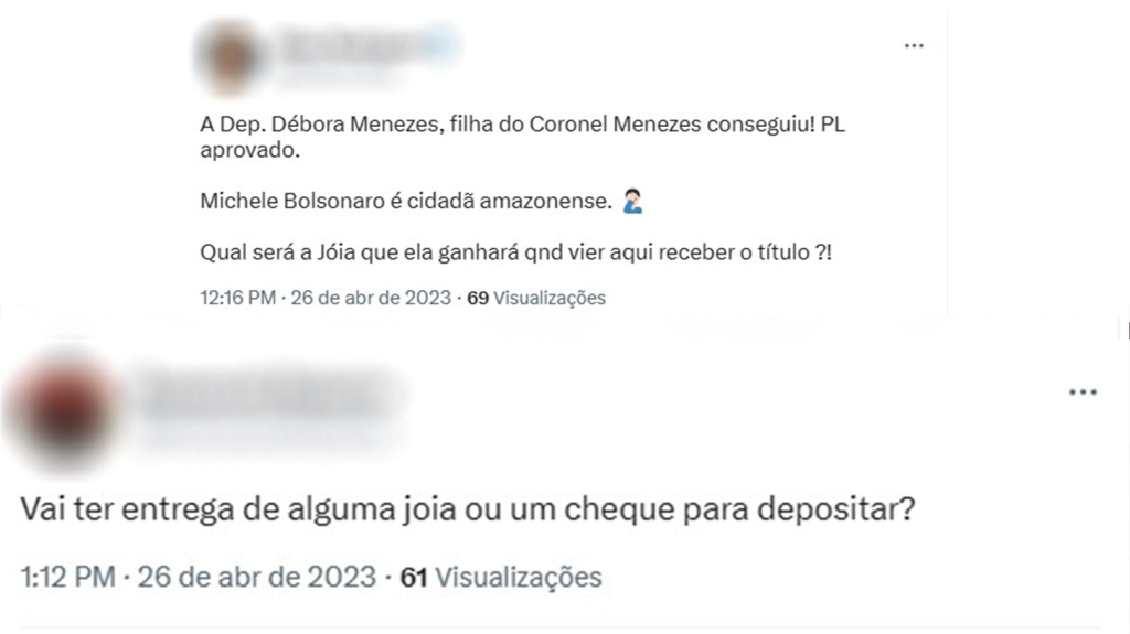 Na internet, não faltaram críticas e ironias à honraria concedida a ex-primeira-dama, nas redes sociais. “Vai ter entrega de alguma joia ou um cheque para depositar?”, questionou um internauta no Twitter. “A deputada Débora Menezes, filha do Coronel Menezes conseguiu! PL aprovado. Michele Bolsonaro é cidadã amazonense. Qual será a joia que ela ganhará quando vier receber o título!?”, também ironizou outro usuário da rede: “Tá fácil assim conseguir título de cidadão amazonense? Eu já quero o meu!”, debochou o internauta.