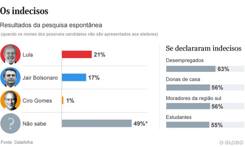 O número é semelhante a de levantamentos feitos em momentos semelhantes de eleições passadas pelo mesmo instituto. Os indecisos eram 52% no fim do primeiro semestre de 2017 e 50%, no mesmo período de 2013. Analistas acreditam que há espaço para uma eventual candidatura de centro crescer entre jovens e desempregados, grupos atingidos diretamente por restrições da pandemia do coronavírus e a crise econômica.