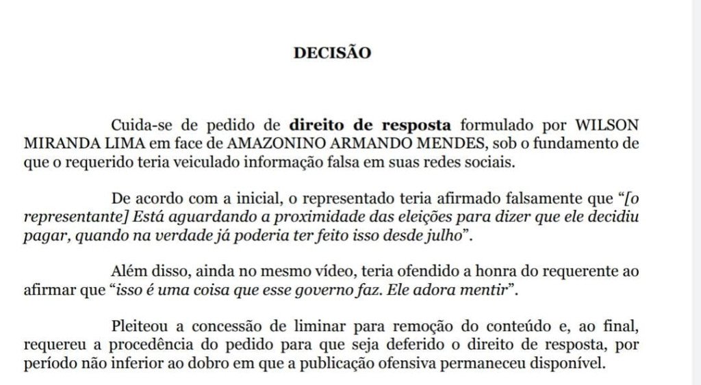 MANAUS – O juiz Márcio André Lopes Cavalcante, do Tribunal Regional Eleitoral do Amazonas (TRE-AM), concedeu nessa sexta-feira, 19, direito de resposta ao atual governador do Estado, Wilson Lima (União Brasil), contra o candidato ao governo Amazonino Mendes (Cidadania), por veiculação de informação falsa, nas redes sociais, tendo como pauta o pagamento do Fundo de Manutenção e Desenvolvimento do Ensino Fundamental e de Valorização do Magistério (Fundef).