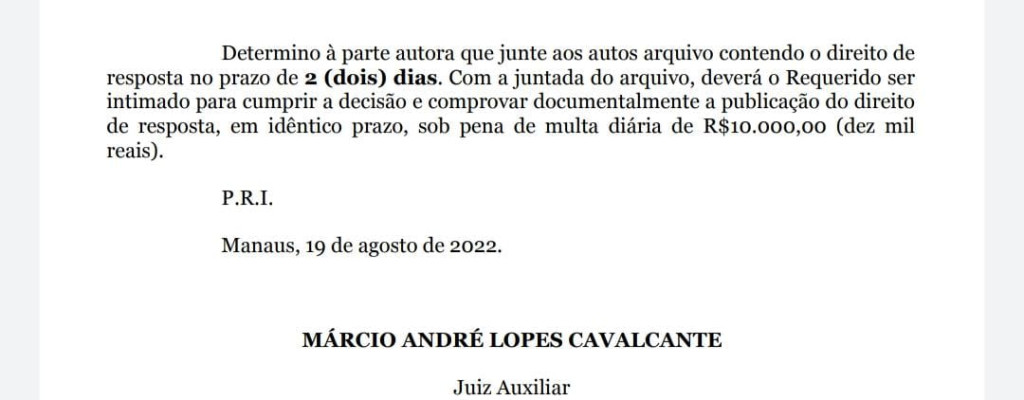 “Determino à parte autora que junte, aos autos, arquivo contendo o direito de resposta no prazo de 2 (dois) dias. Com a juntada do arquivo, deverá o Requerido ser intimado para cumprir a decisão e comprovar, documentalmente, a publicação do direito de resposta, em idêntico prazo, sob pena de multa diária de R$ 10.000,00 (dez mil reais)“, consta a decisão.