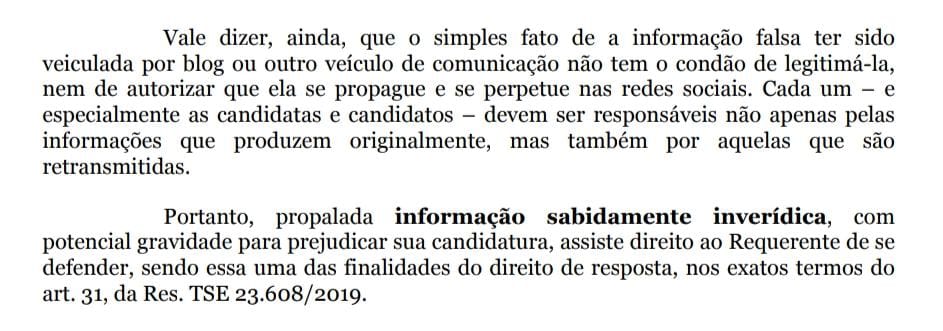 Segundo a decisão, uma das principais preocupações da Justiça Eleitoral, nas últimas duas eleições, e também durante o pleito deste ano, são justamente voltadas às desinformações nas propagandas eleitorais. O juiz ressalta a necessidade de fiscalização e repressão, por parte da Justiça Eleitoral, aos candidatos que façam a “utilização de informações sabidamente falsas”.