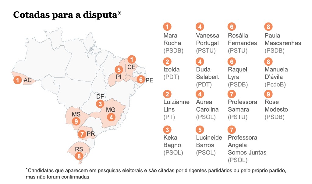Feito com base em pesquisas eleitorais e indicações dos próprios partidos, o levantamento do GLOBO também mapeou outros seis Estados em que há nomes cotados, ou seja, cuja pré-candidatura não foi oficializada, mas é considerada. É o caso de Minas Gerais, Pernambuco e Mato Grosso do Sul. Mas, em 14 Estados, sequer há candidatas sendo citadas, como São Paulo, onde vive cerca de 20% da população brasileira, Rio, onde moram 8%, e Bahia, com 7%.