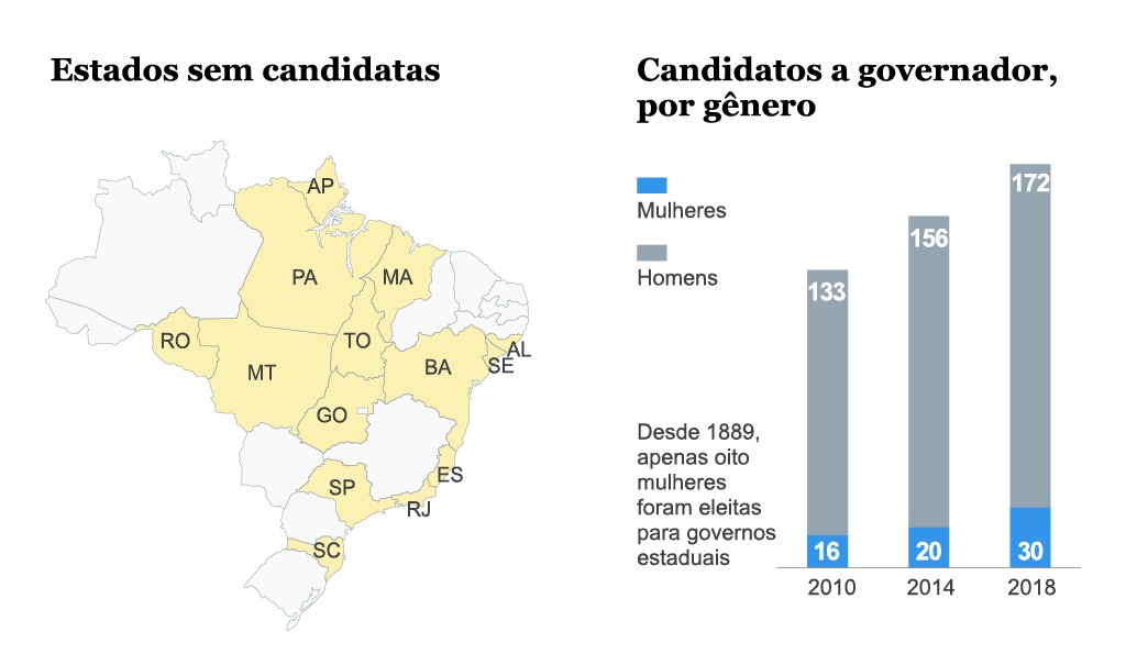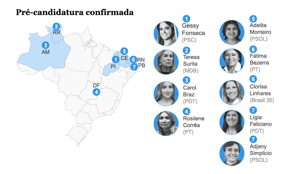 Considerando apenas as pré-candidatas ao governo já confirmadas pelos partidos, só Amazonas, Ceará, Distrito Federal, Paraíba, Piauí, Rio Grande do Norte e Roraima têm postulantes. São, ao todo, nove mulheres, das quais cinco se autodeclaram brancas, quatro pardas e nenhuma preta, indígena ou asiática. No CE, DF e PI, além dos nomes já confirmados, há também outras candidatas que cogitam disputar o pleito.