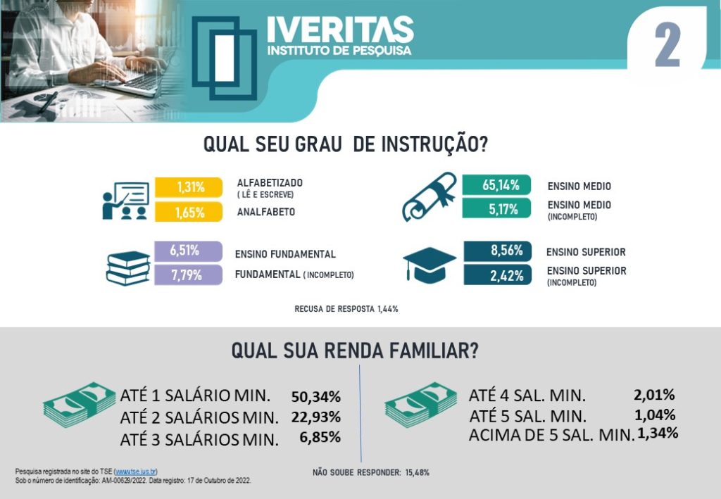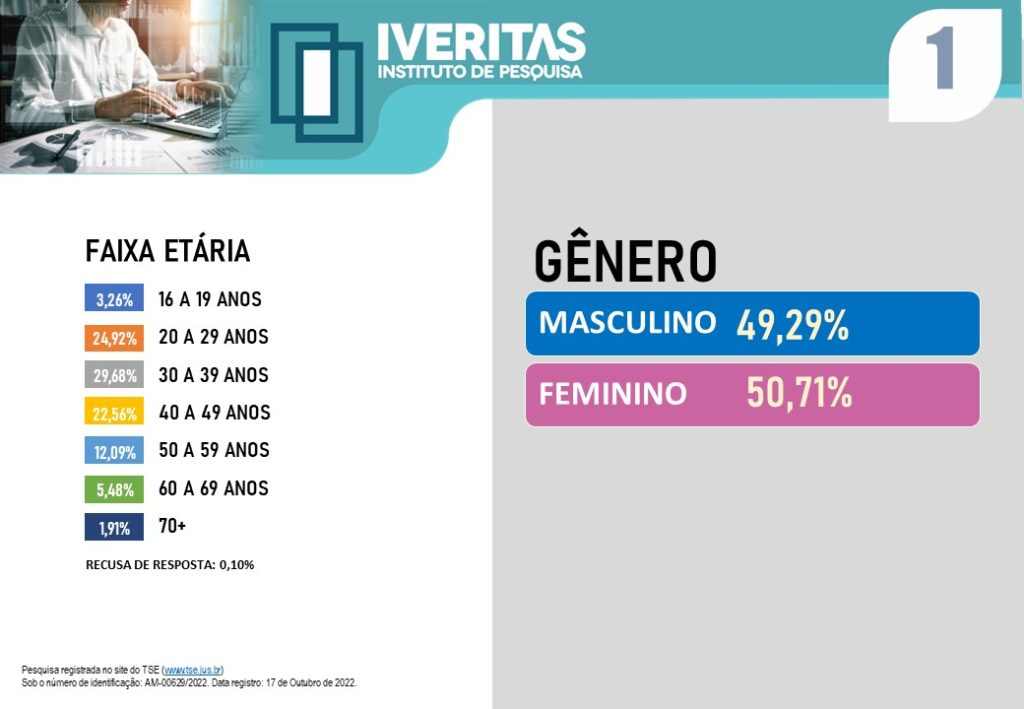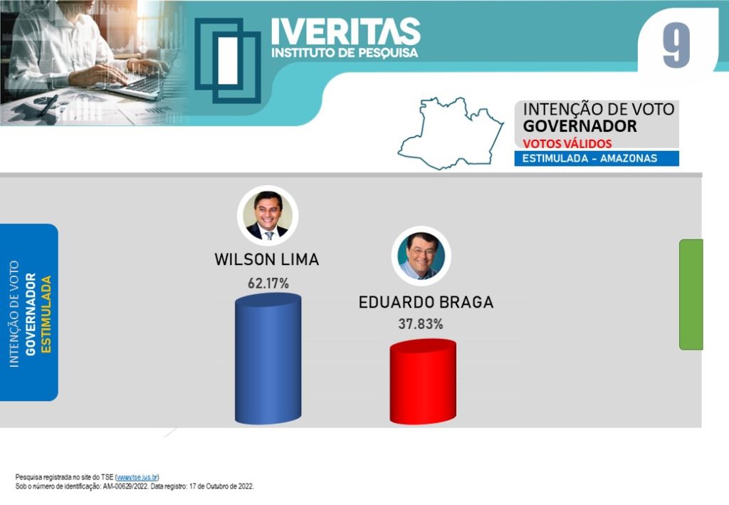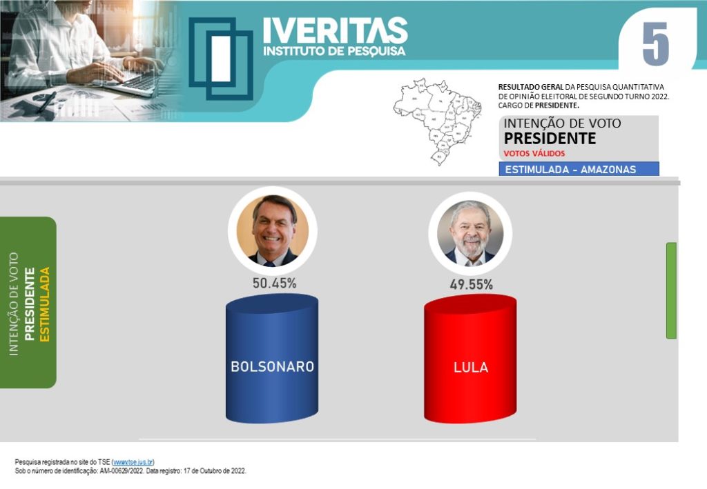 MANAUS – Pesquisa feita pelo Instituto Iveritas, registrada no Tribunal Superior Eleitoral (TSE) com o número AM-00629/2022, na data de 17/10/2022, em que foram ouvidas 2.978 pessoas presencialmente em Manaus, Iranduba, Manacapuru, Presidente Figueiredo, Rio Preto da Eva, Itacoatiara, Maués, Parintins, Autazes, Coari e Tefé, mostra a disputa presidencial empatada tecnicamente no Estado, em votos válidos, com um ligeira liderança do presidente Jair Bolsonaro (PL) (50,45% a 49,55%, respectivamente).