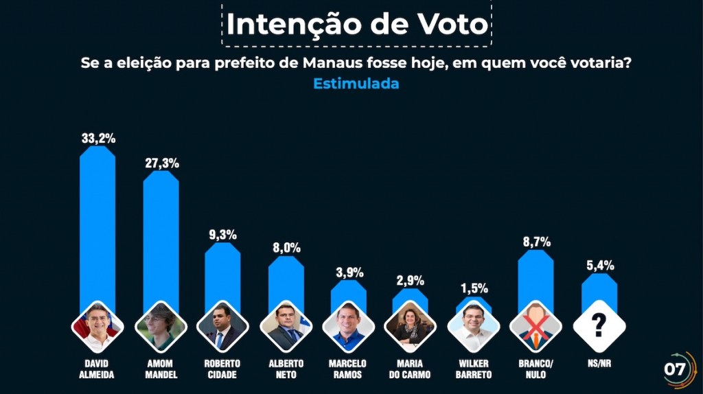 Na coleta de resposta estimulada, onde os entrevistadores apresentam uma lista de candidatos, Roberto Cidade aparece com 9,3% à frente de Alberto Neto (8%), seguido por Marcelo Ramos (3,9%), Maria do Carmo (3,9%) e Wilker Barreto (1,5%). Os votos brancos/nulos somam 8,7%, e 5,4% dos entrevistados não souberam responder. David Almeida lidera com 33,2%, seguido por Amom Mandel com 27,3%.