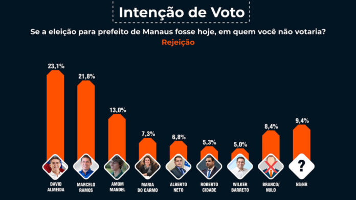 Em contrapartida à liderança na primeira enquete, a pesquisa de rejeição indica que o atual prefeito, David Almeida (Avante), é o candidato mais rejeitado pelos eleitores de Manaus. Segundo o levantamento, 23,1% dos entrevistados afirmaram que não votariam no prefeito se a eleição fosse hoje. Marcelo Ramos tem 21,8% de rejeição; Amom Mandel tem 13,1%; Maria do Carmo está com 7,3%; e Alberto Neto tem 6,8%. Entre os menos rejeitados estão Roberto Cidade, com 5,3%, e Wilker Barreto, com 5%.