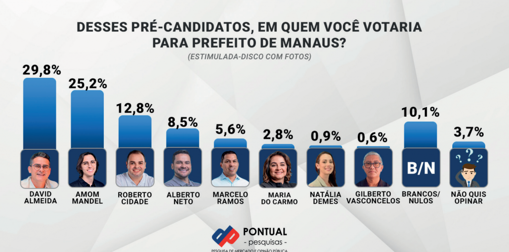 MANAUS (AM) – O Instituto Pontual Pesquisas divulgou nesta segunda-feira, 22, a terceira sondagem eleitoral para a Prefeitura de Manaus, que revelou que o prefeito David Almeida (Avante), em comparação com a última pesquisa divulgada e considerando a margem de erro de 3%, estagnou com 29,8% das intenções de voto. O deputado Amom Mandel (Cidadania) caiu para 25,2%, enquanto o deputado estadual e presidente da Assembleia Legislativa do Amazonas (Aleam) avançou para 12,8%.