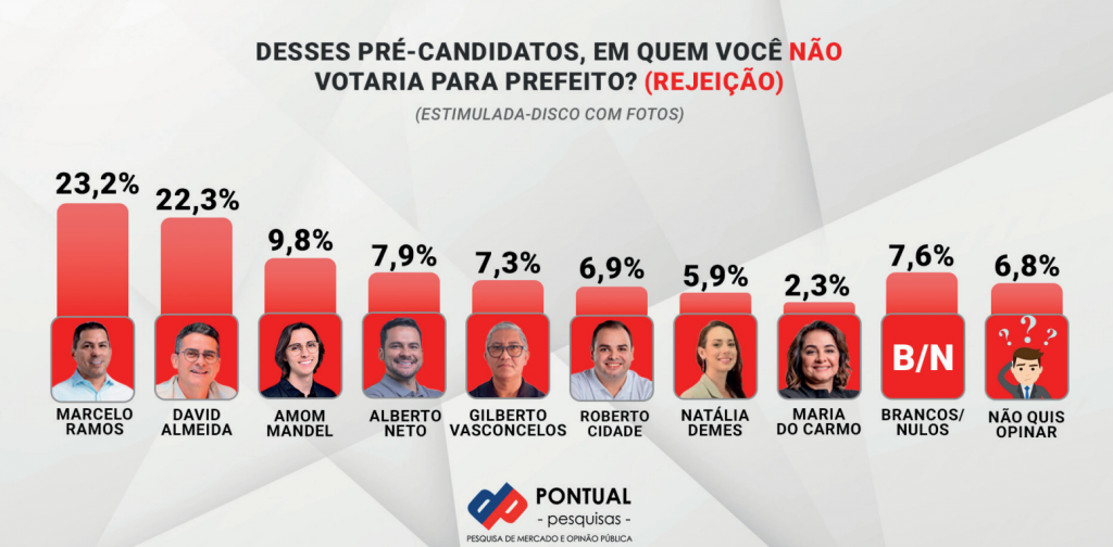 Quanto aos candidatos mais rejeitados, o petista Marcelo Ramos lidera o cenário com 23,2%, seguido por David Almeida (22,3%), Amom Mandel (9,8%), Alberto Neto (7,9%), Gilberto Vasconcelos (7,3%), Roberto Cidade (6,9%), Natália Demes (5,9%) e Maria do Carmo (2,3%). Brancos e Nulos são 7,6% e não quiseram opinar foram 6,8%.