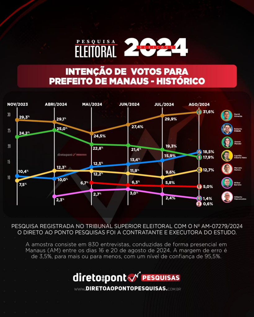 MANAUS (AM) – A mais recente pesquisa eleitoral de 2024 à Prefeitura de Manaus indica um novo cenário para o segundo turno das eleições municipais: Roberto Cidade (União Brasil) ultrapassou Amom Mandel (Cidadania) e entrou na disputa para o segundo turno na capital amazonense. A pesquisa foi divulgada nesta sexta-feira, 23, pelo Direto ao Ponto, e registrada sob o número AM-07279/2024 no Tribunal Superior Eleitoral (TSE).