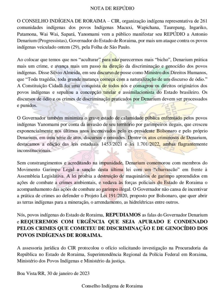“Nós, povos indígenas do Estado de Roraima, repudiamos as falas do governador Denarium