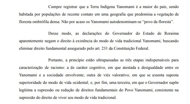 “Portanto, a princípio estão ultrapassadas as três etapas indispensáveis para caracterização de racismo: a de caráter cognitivo, em que atestada a desigualdade entre os Yanomami e a sociedade envolvente; outra de viés valorativo, em que se assenta suposta superioridade do modo de vida ocidental; e, por fim, uma terceira, onde o governador supõe legítima a supressão ou redução de direitos fundamentais do Povo Yanomami, consistente na supressão do direito de viver seu modo de vida tradicional”, escreve o procurador.