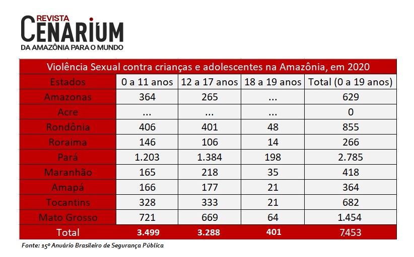 MANAUS – Os Estados da Amazônia Legal registraram, em 2020, o total de 7.453 casos de violência sexual contra crianças e adolescentes entre 0 a 19 anos. Segundo o levantamento do 15º Anuário Brasileiro de Segurança Pública, divulgado nessa quinta-feira, 15, Pará e Mato Grosso foram os que apresentaram os maiores índices, com o total de 2.785 e 1.454 casos, respectivamente.