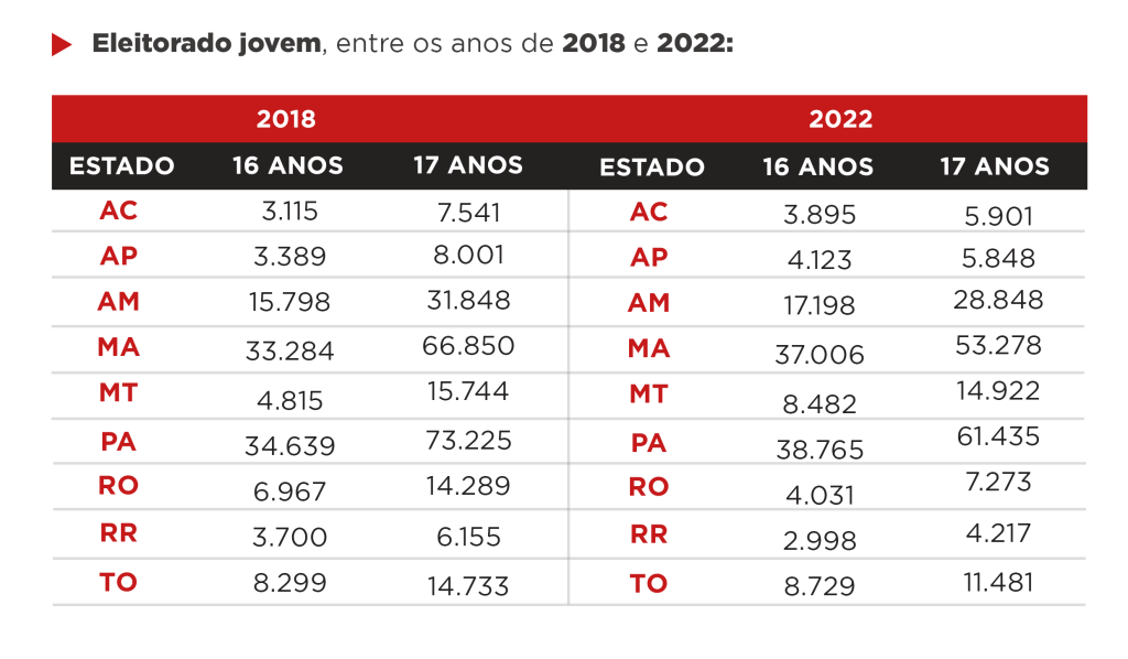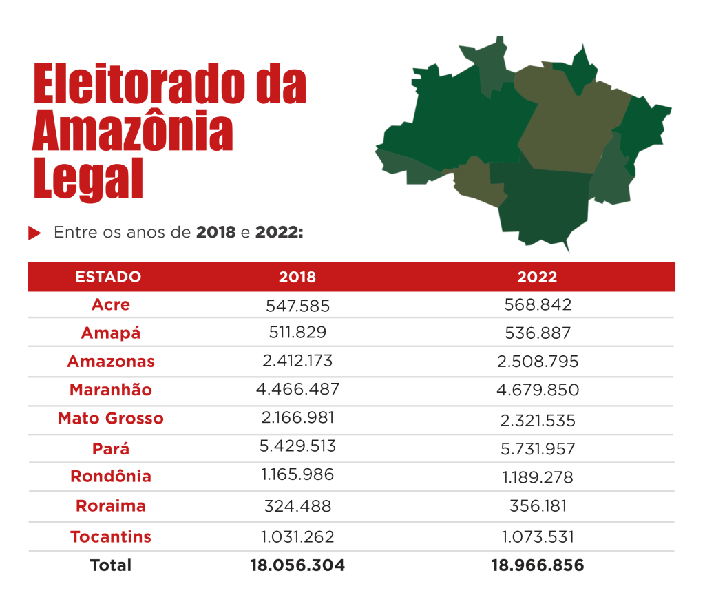 No Brasil, entre os 18 e 69 anos, o voto é obrigatório, passível de multa em caso de falta. No ano de 2018, o total do eleitorado adulto, na Amazônia Legal, era de 16.561.486 milhões de pessoas. Em 2022, esse número é de 17.603.519 milhões, um aumento de 6,2% no eleitorado.