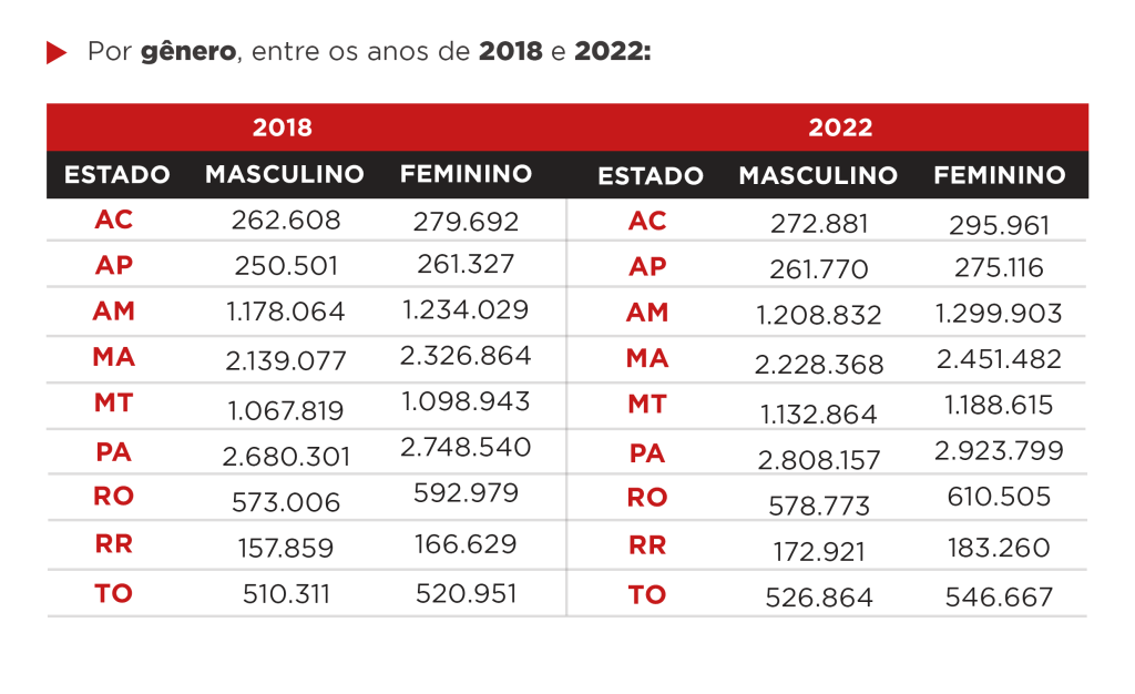 No Pará são 2.923.799 (51%) eleitoras mulheres, contra 2.808.157 (48%) eleitores homens. No Maranhão, o número é de 2.451.482 (52%) mulheres ativas e 2.228.368 (47%) homens cadastrados. Já no Amazonas, o número é de 1.299.903 (51%) mulheres e 1.208.832 (48%) homens. Entre os que não informaram gênero, o Estado de Mato Grosso lidera, com 56 registros sem gênero informado, já o Pará tem um, assim como o Amapá, nos outros Estados o número fica em zero.