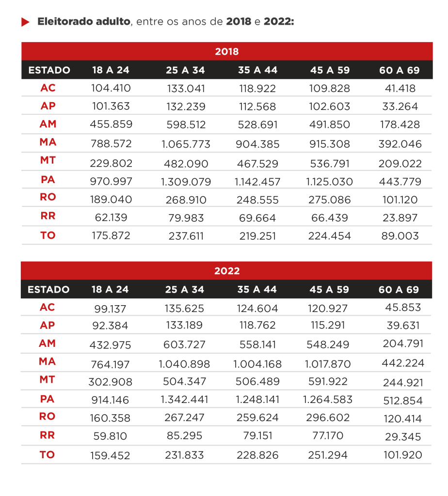 Na faixa entre 18 e 69 anos, o Pará possui 5.282.165 milhões de eleitores, seguido pelo Maranhão com 4.269.357 milhões e o Amazonas com 2.347.883 milhões, sendo os maiores colégios eleitorais entre os nove Estados.