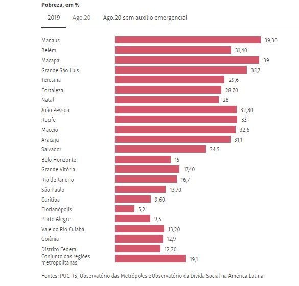Na região metropolitana de Macapá, por exemplo, 39% da população estava na pobreza em 2019. Considerando a renda adicional com os auxílios, a parcela da população que vivia na pobreza passou a ser 29,5% em agosto de 2020. Sem os auxílios e contabilizando apenas os ganhos com o trabalho em agosto, os pesquisadores identificaram que mais da metade da população local estaria na pobreza, ou 51,4%.