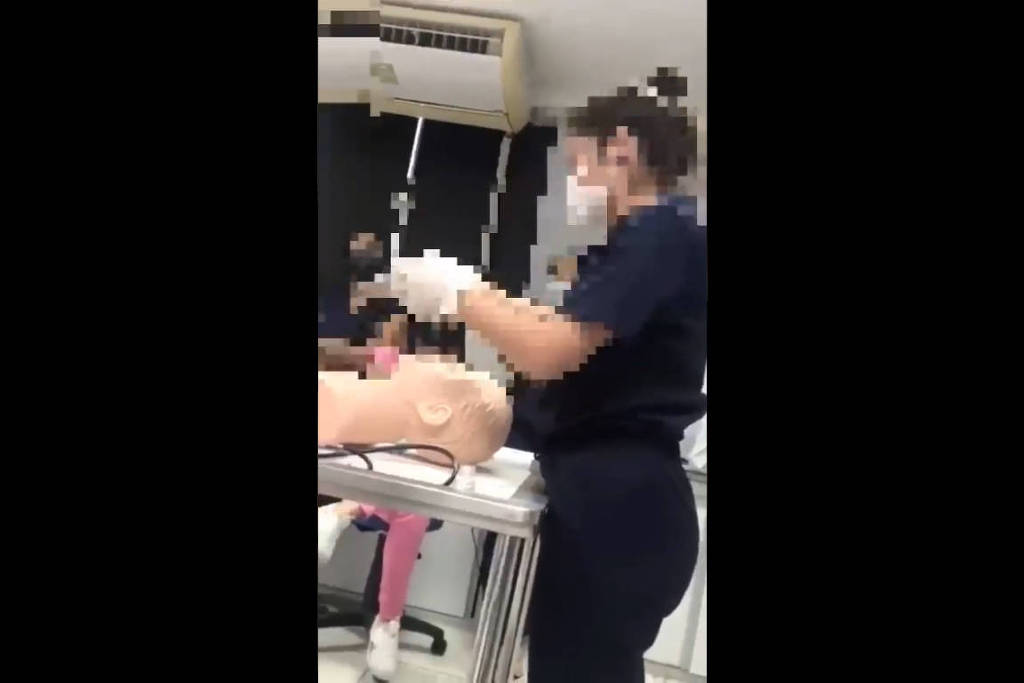As imagens viralizaram nas redes sociais na manhã da quinta-feira, 25, e mostram, inicialmente, o professor ensinando as alunas a fazerem um procedimento de intubação utilizando um boneco, em uma simulação do que ocorre com seres humanos.