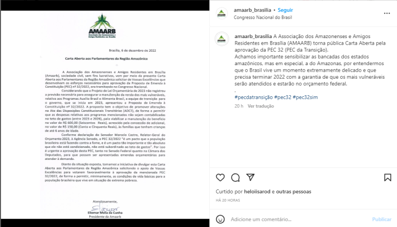 MANAUS – A Associação dos Amazonenses e Amigos Residentes em Brasília (Amaarb) publicou carta aberta nessa terça-feira, 6, pedindo que parlamentares da região amazônica realizem todos os esforços necessários para aprovação da “PEC da Transição”, proposta que libera espaço no Orçamento de 2023 para programas sociais e o aumento real do salário mínimo.