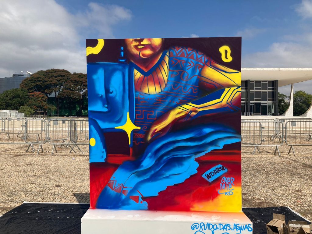 Sob as cores azul, vermelho, amarelo e preto, o grafite feito por Chermie Ferreira, na Praça dos Três Poderes, mostra uma indígena com grafismo do povo Kokama e do povo Mura costurando uma peça de pano. Segundo a artista plástica, a obra representa as mulheres originárias, que vivem e sobrevivem do ateliê no Estado do Amazonas.