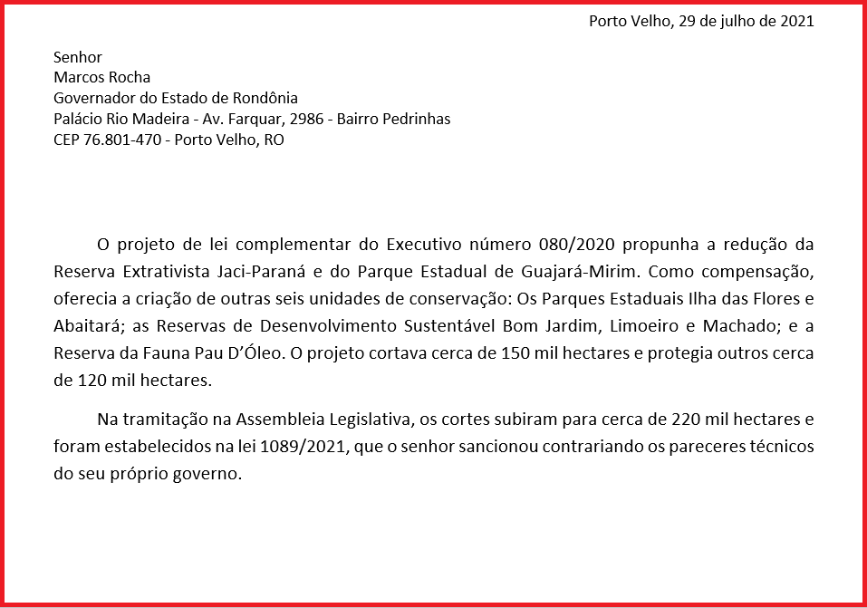 A carta parte da Lei Complementar nº 1.089/2021, sancionada por Marcos Rocha, que diminui duas Unidades de Conservação (UC): a Reserva Extrativista (Resex) Jaci-Paraná e o Parque Estadual (PES) de Guajará-Mirim. Na época, foi considerada a maior redução de áreas protegidas já aprovada por alguma unidade da Federação, com quase 220 mil hectares extraídos dos territórios das duas reservas ambientais.