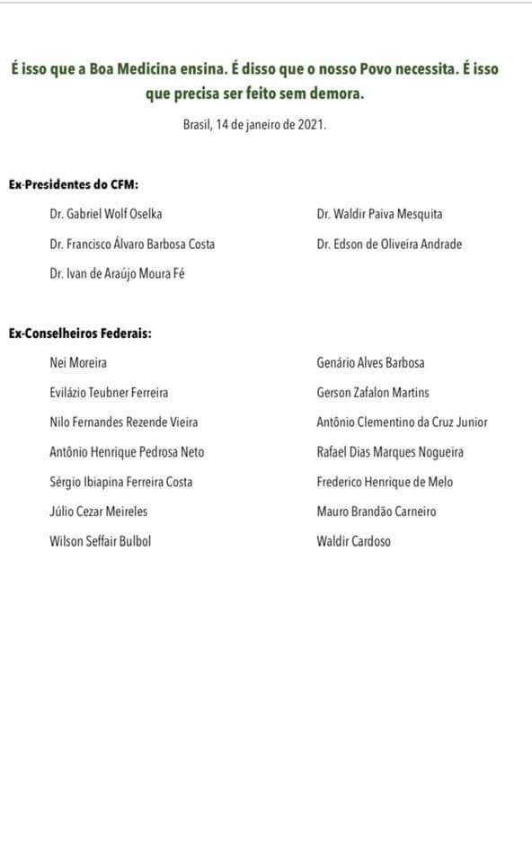 O documento é assinado por 19 ex-presidentes e ex-conselheiros da autarquia. “Conclamamos que o CFM a que se manifeste publicamente em defesa da vida da nossa gente; em defesa do exercício da profissão; e em defesa dos milhares de médicos e médicas, bem como de seus companheiros das equipes de saúde, que estão cumprindo os seus deveres profissionais e arriscando suas vidas”, conclamam.