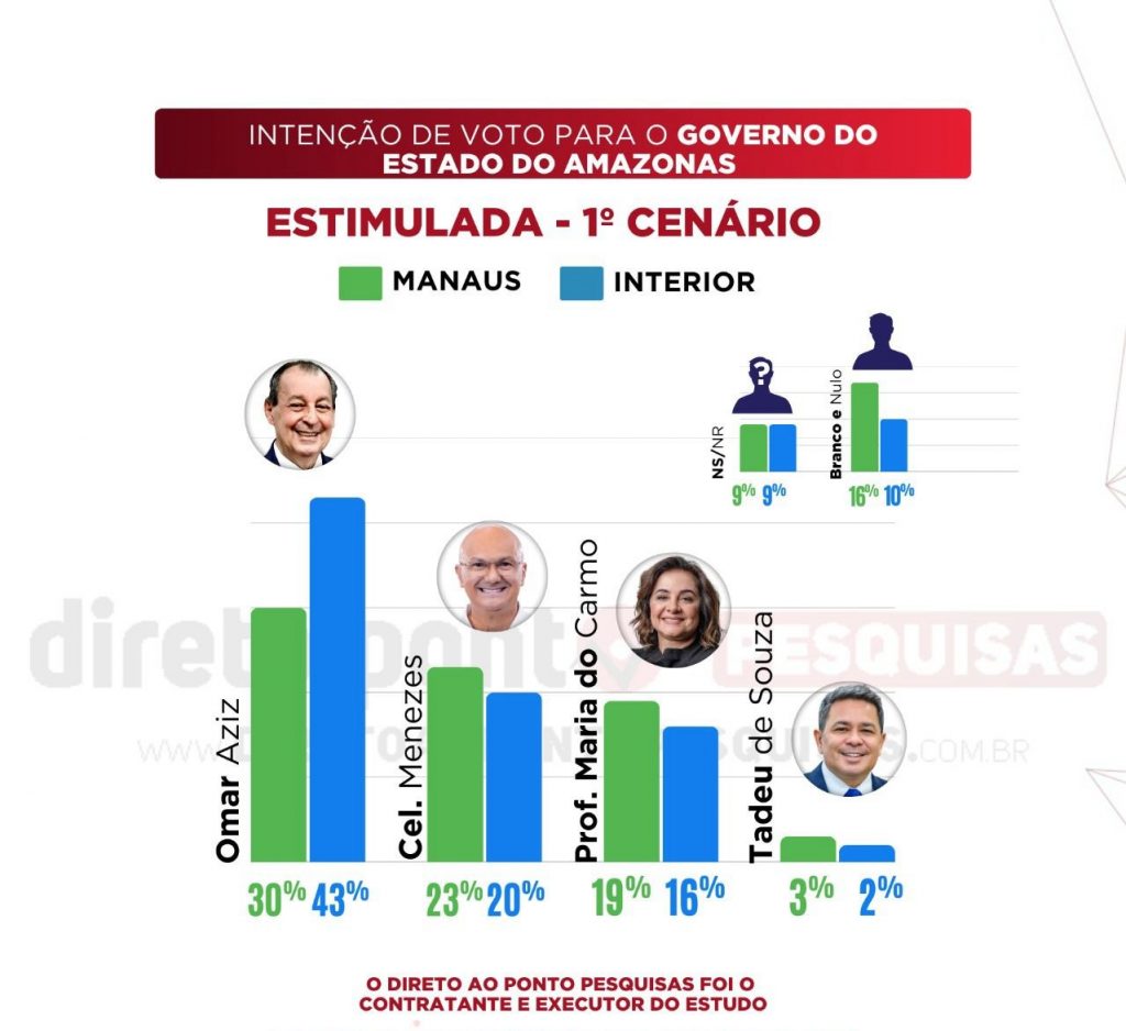 Neste cenário, a pesquisa segmentada entre eleitores de Manaus e do interior mostra que Omar Aziz lidera em ambas as regiões, com 30% na capital e 43% no interior. Menezes aparece com 23% em Manaus e 20% no interior, e Maria do Carmo tem 19% das intenções de voto na capital e 16% no interior. Tadeu de Souza registra 3% em Manaus e 2% no interior. Os percentuais de indecisos são de 9% tanto na capital quanto no interior, enquanto votos em branco e nulos somam 16% em Manaus e 10% no interior.