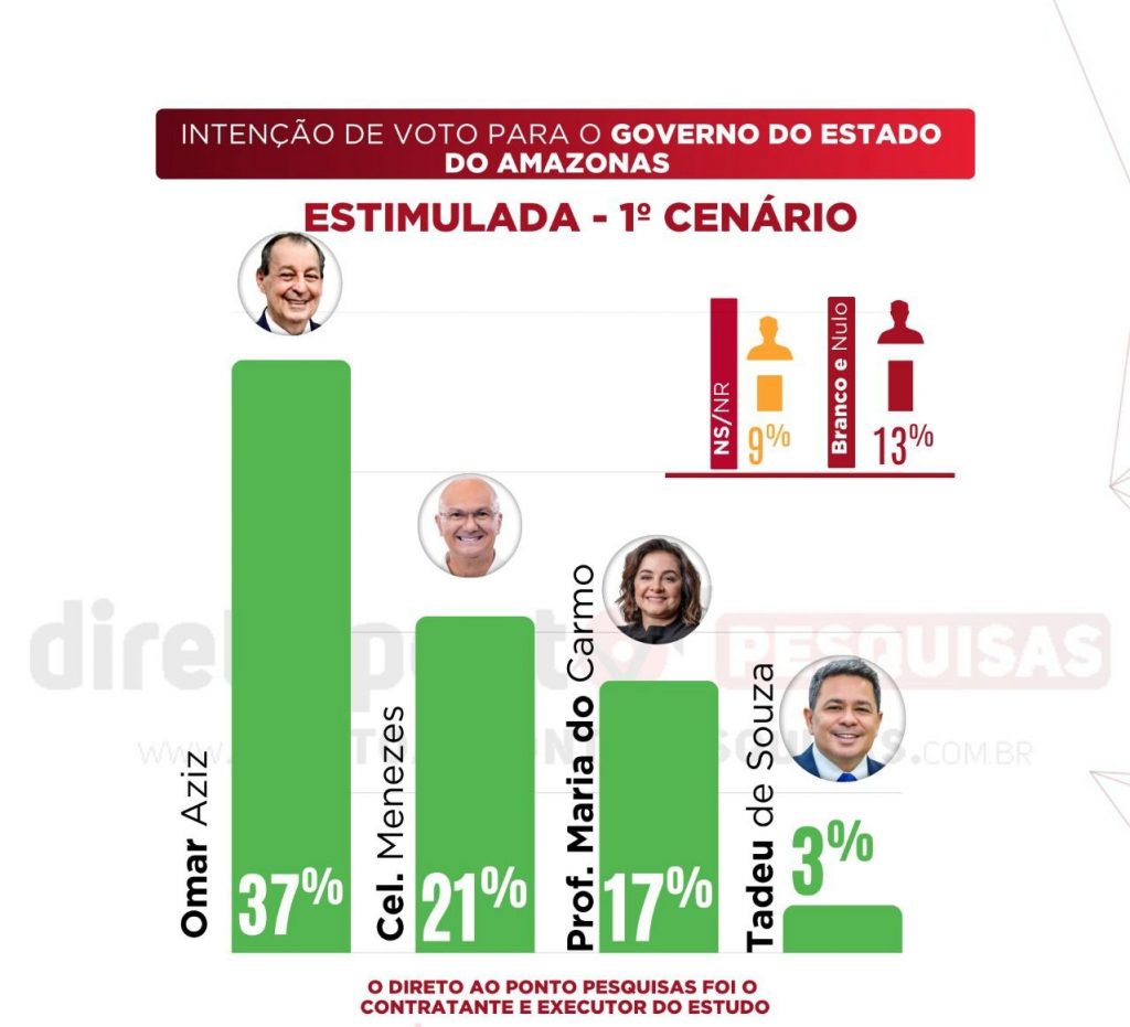 De acordo com a pesquisa, em um cenário que considera Aziz, Coronel Menezes (PL), Maria do Carmo Seffair e Tadeu de Souza, o senador lidera com 37% das intenções de voto. Em segundo lugar, aparece Menezes, com 21%, seguido de Maria do Carmo, com 17%, e de Tadeu de Souza, com 3%. Além disso, 9% dos entrevistados não souberam ou não responderam, e 13% afirmaram que votariam em branco ou nulo.