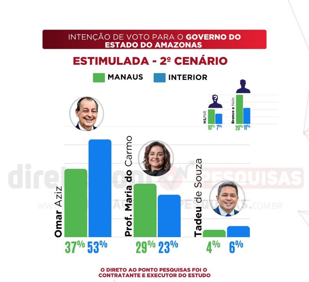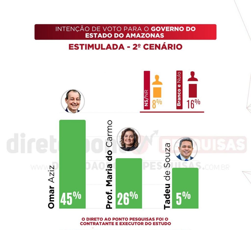 No segundo cenário estimulado da pesquisa de intenções de voto para o Governo do Estado do Amazonas, Omar Aziz aparece com 45% das intenções de voto. Em segundo lugar, está Maria do Carmo, com 26%, seguida por Tadeu de Souza, que soma 5%. Dos entrevistados, 8% não souberam ou não responderam e 16% declararam intenção de votar em branco ou nulo.