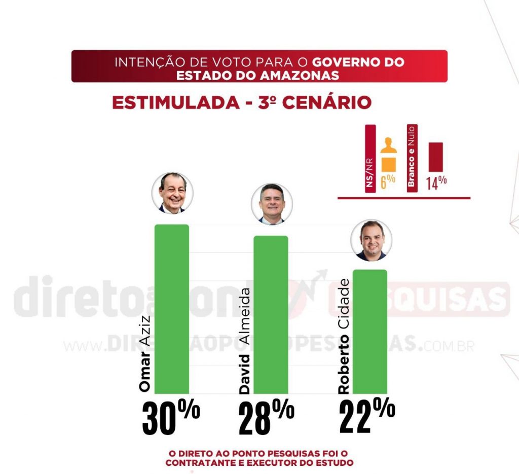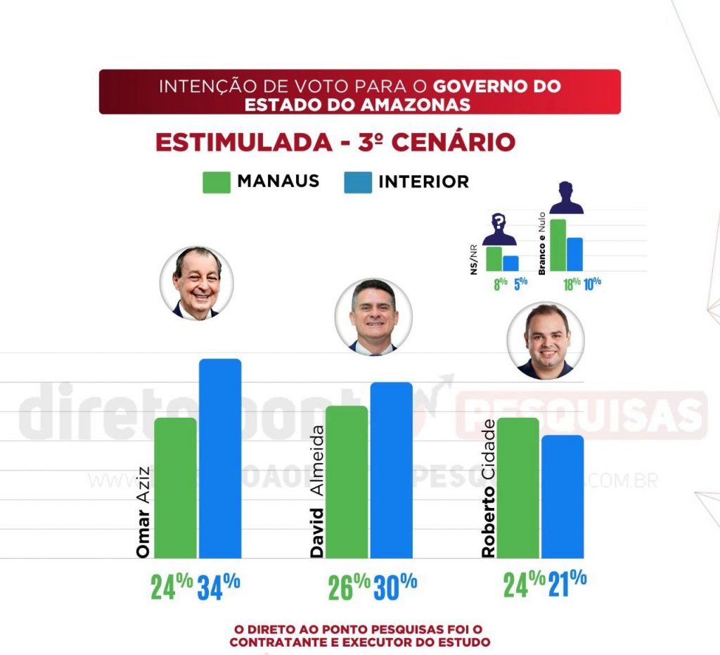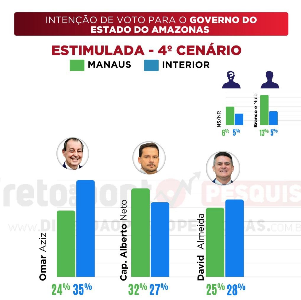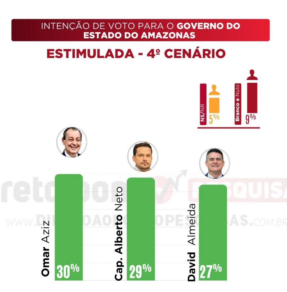 O empate consta no quarto cenário da pesquisa estimulada, que considerou três candidatos: Omar Aziz, Alberto Neto e o prefeito de Manaus, David Almeida (Avante). Enquanto Aziz e Alberto registraram 30% e 29%, respectivamente, Almeida aparece com 27%. Não souberam ou não responderam somam 5%, e os votos brancos e nulos, 9%.