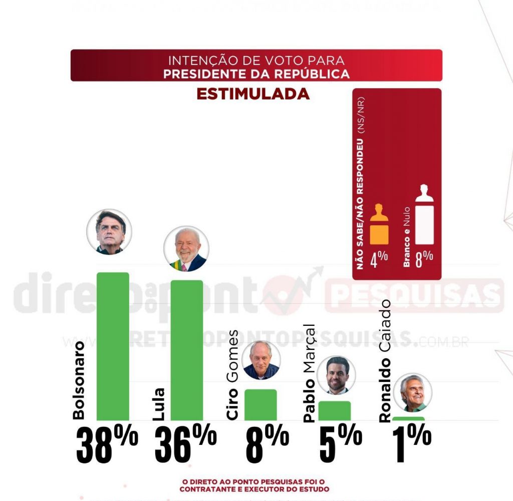 A pesquisa do Direto ao Ponto também considerou o cenário à Presidência da República para as eleições de 2026. Na pesquisa estimulada, Jair Bolsonaro (PL) — que está inelegível até 2030 — aparece na liderança, com 38% das intenções, seguido de perto pelo presidente Luiz Inácio Lula da Silva (PT), com 36%.