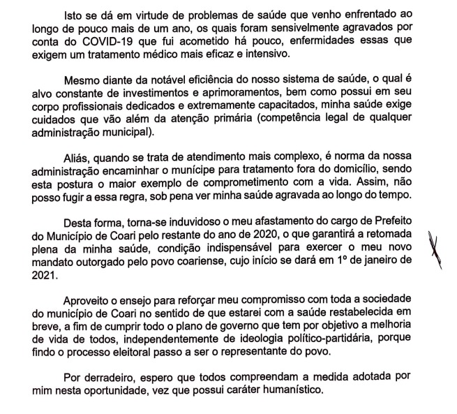 “Desta forma, torna-se induvidoso o meu afastamento do cargo de prefeito do município de Coari pelo restante do ano de 2020, o que garantirá a retomada plena da minha saúde, condição indispensável para exercer o meu novo mandato outorgado pelo povo coariense, cujo início se dará em 1º de janeiro de 2021”, diz trecho do documento.