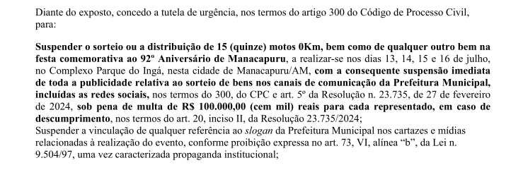 De acordo com a decisão, a divulgação dos sorteios pela administração municipal caracteriza publicidade institucional proibida desde último sábado, 6. A Justiça Eleitoral determinou, ainda, que fossem retiradas todas as referências ao slogan da Prefeitura de Manacapuru dos materiais promocionais do evento, caracterizando isso como propaganda institucional proibida desde o início de julho. Os representados devem ser notificados e têm um prazo de cinco dias para apresentarem suas manifestações nos autos, caso desejem.