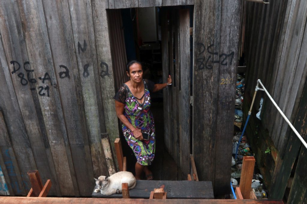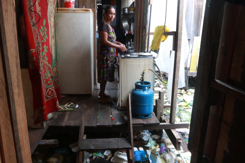 Apreensiva, Ivone Moura mostra à CENARIUM a área atrás do imóvel dela onde estão a geladeira, o fogão e o gás de cozinha, sob um vão que segue em direção ao Rio Negro e à vizinhança. O medo é que uma forte chuva atinja a cidade e cause mais transtornos a ela.