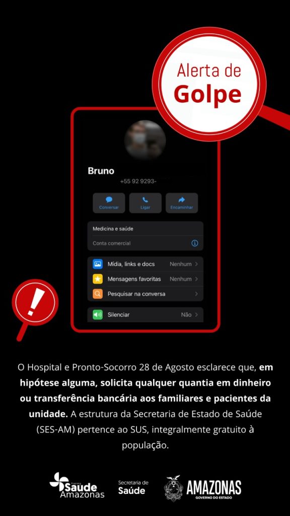 MANAUS – O Hospital e Pronto-Socorro (HPS) 28 de Agosto esclarece que, em hipótese alguma, solicita qualquer quantia em dinheiro ou transferência bancária aos familiares e pacientes da unidade. A estrutura da Secretaria de Estado de Saúde (SES-AM) pertence ao Sistema Único de Saúde (SUS), que é integralmente gratuito para a população.