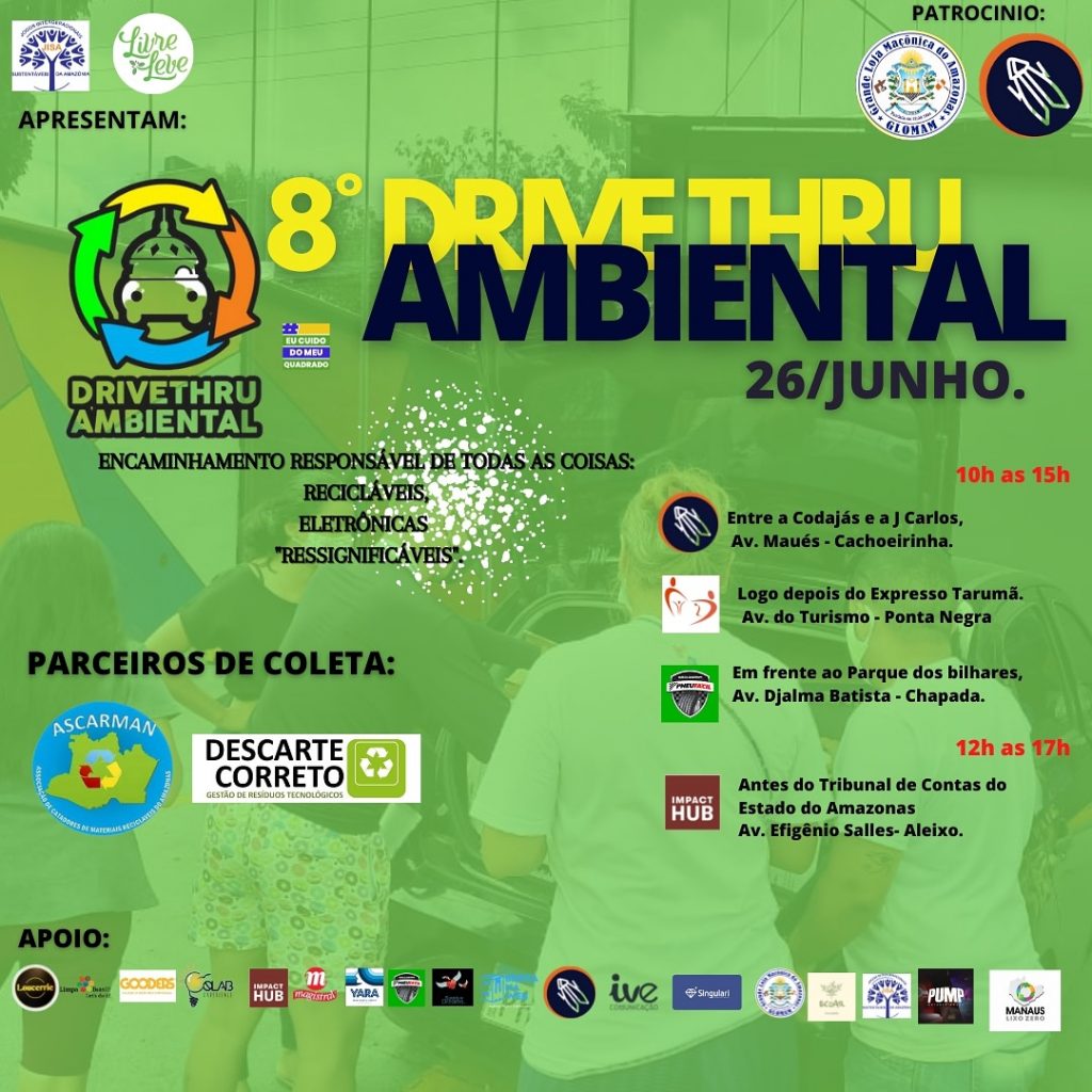 MANAUS – Neste sábado, 26, acontece mais uma edição do projeto “Drive Thru Ambiental”, que tem o objetivo de chamar a atenção da população amazonense para o descarte correto do lixo eletrônico e insumos recicláveis. Até as 17h de hoje, quatro pontos estarão recebendo os resíduos.