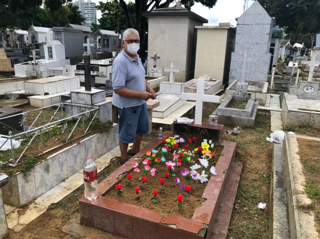 Aproveitando o acesso livre, o aposentado Afonso Celso Farias, de 59 anos, também foi prestar homenagens à esposa Irinete Cunha, com quem foi casado durante 40 anos. Ela morreu no dia 14 de janeiro deste ano aos 59 anos – também em decorrência da Covid-19.
