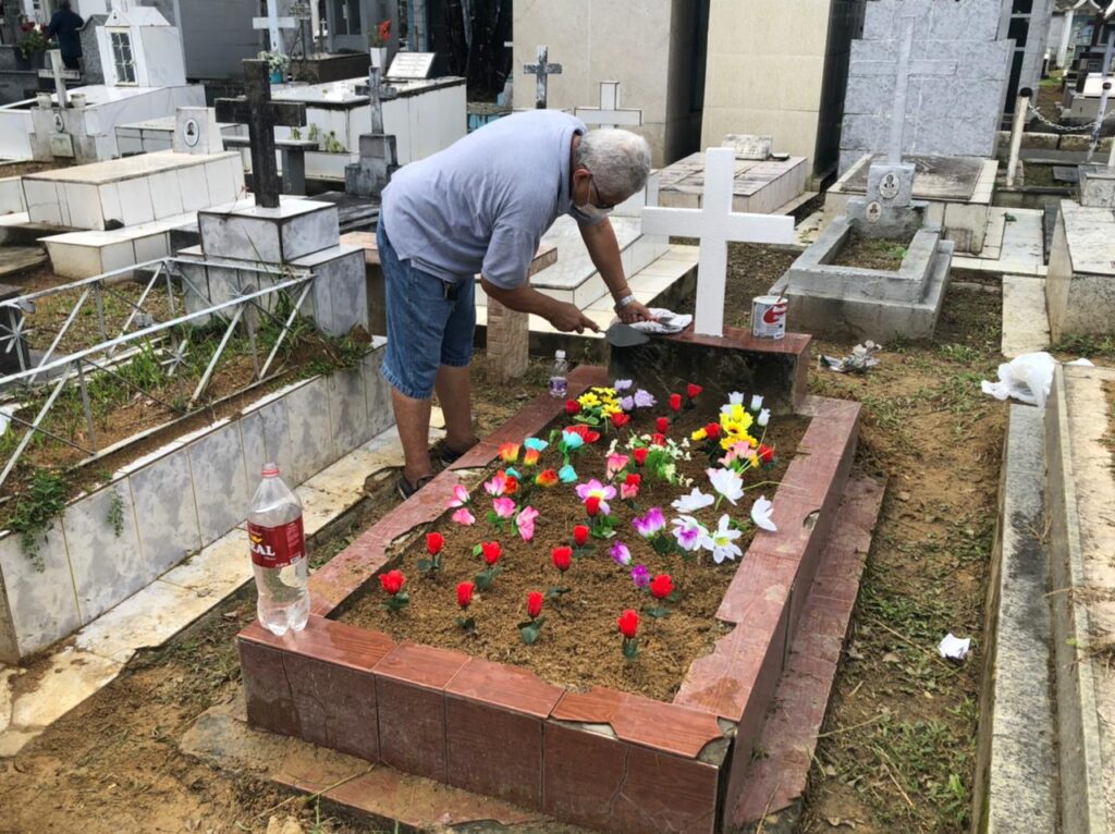 Além de flores e velas, o aposentado reforçou a manutenção da lápide da esposa e contou que não conseguiu ir até o local anteriormente. “Desde quando ela foi enterrada, vim para entrar no cemitério, mas estava fechado, não me deixaram entrar”, disse ele.