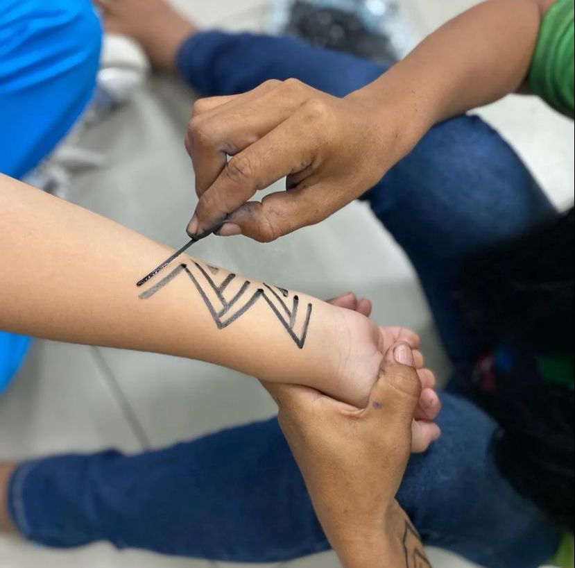 “A pintura de animais como o peixe e a jiboia é feita em crianças nas aldeias, por isso eu trouxe esses grafismos, para também serem pintados nos alunos em sala de aula. O grafismo da jiboia, por exemplo, representa a prosperidade. E para mim é muito importante enraizar esse conhecimento dentro das escolas, porque os grafismos originários têm que perseverar para a valorização da nossa cultura. Essa é a nossa identidade“, diz ela, que também vai utilizar o urucum nesta sexta-feira.