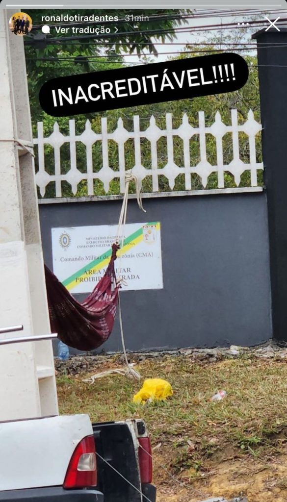 O apresentador Ronaldo Tiradentes também compartilhou, pelas redes sociais, como se encontra a permanência dos apoiadores na calçada do Comando Militar da Amazônia. Na imagem publicada no Instagram, é possível ver que uma rede foi instalada próxima à placa que alerta: “Área militar. Proibida a entrada”. “Inacreditável”, comentou ele.