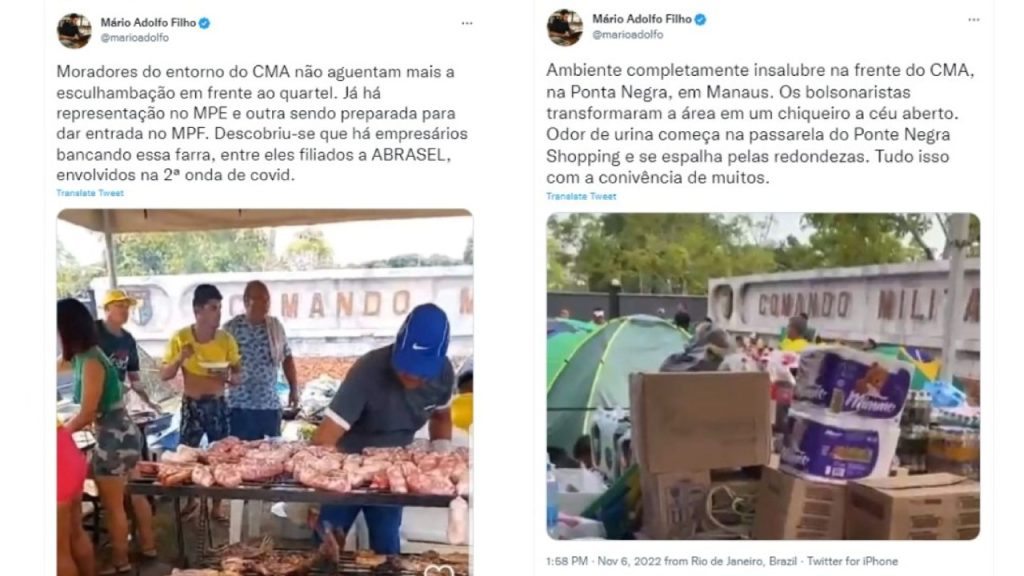 “Ambiente completamente insalubre na frente do CMA, na Ponta Negra, em Manaus. Os bolsonaristas transformaram a área em um chiqueiro a céu aberto. Odor de urina começa na passarela do Ponta Negra Shopping e se espalha pelas redondezas. Tudo isso com a conivência de muitos“, disse ele.