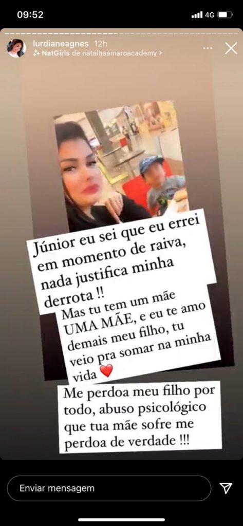Nas redes sociais, Lurdiane Agnes admitiu que errou e que teve um momento de raiva e que nada justificava a atitude com o filho. “Eu te amo demais meu filho, tu veio para somar na minha vida. Me perdoa meu filho todo abuso que tua mãe sofre, me perdoa de verdade”, disse na postagem ao lado da criança.