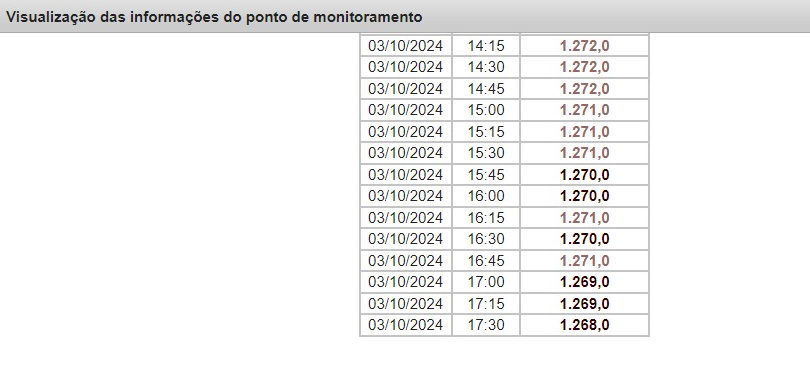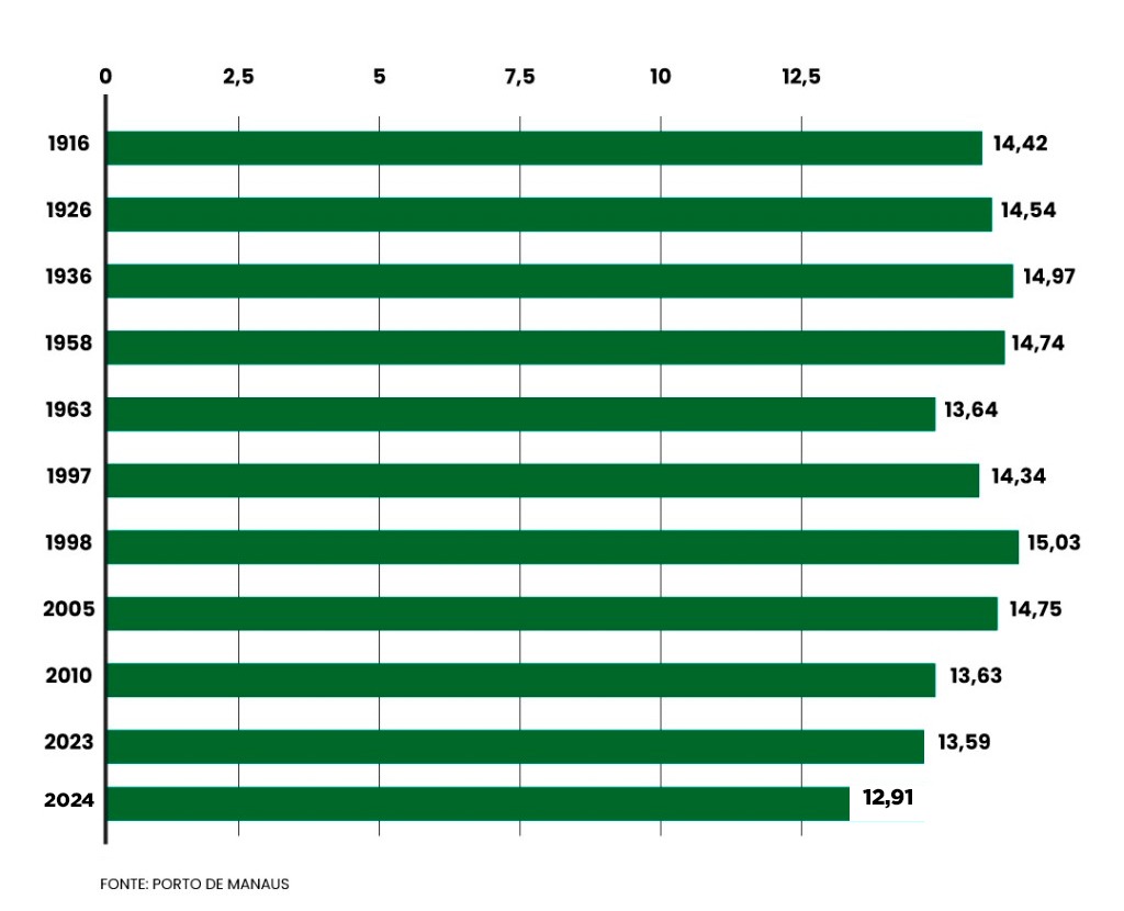 O Rio Negro, em comparação ao mesmo período do ano anterior, havia registrado 15,29 metros. De acordo com a medição, o rio vazou até esta quarta-feira, 13,94 metros. O medidor também disponibiliza outros pontos de medição como na localidade do porto privativo Roadway, que realiza o embarque e desembarque de passageiros, registra 17,19 metros.