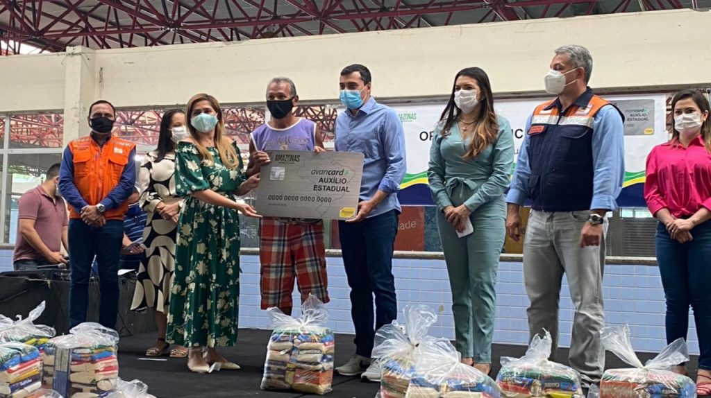 Nesta quarta-feira, no Centro de Convivência do Idoso, bairro de Aparecida, na zona Sul, Wilson Lima entregou os Cartões do Auxílio Estadual no valor de R$ 300 e cesta com alimentos não perecíveis para moradores dos bairros de Aparecida, Glória e São Raimundo. Segundo a Defesa Civil, 5.990 famílias serão beneficiadas com os cartões e cestas por meio da Operação Enchente em Manaus.