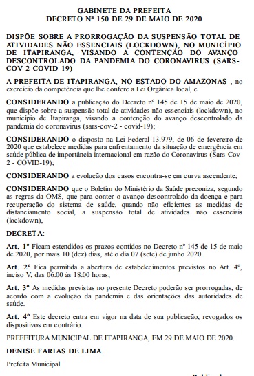 Em Itapiranga, a medida iniciou até no último dia 19 de maio e foi prorrogada na sexta-feira, 29, com validade até o dia 7 de junho. Segundo o novo decreto, o horário de funcionamento do comércio passa a ser das 6h até às 18h, após esse horário, ficam suspensas a circulação de pessoas, sendo permitido, somente, os serviços de delivery e órgãos de competência em cumprimento com o documento.