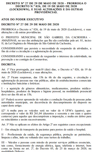 MANAUS – Os municípios de Itapiranga e São Gabriel da Cachoeira, no interior do Amazonas, a 311 e 853 quilômetros de Manaus, respectivamente, prorrogaram os decretos de lockdown até o dia por mais 10 dias. A medida foi publicada nesta segunda-feira, 1º, no Diário Oficial dos Municípios (DOM).