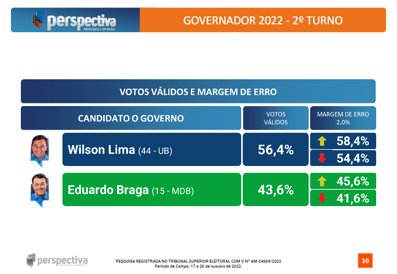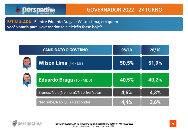 Assim como o Ipec e Eficaz, a Perspectiva Mercado e Opinião traz vantagem de Wilson Lima no segundo turno. O estudo mostra vantagem de Wilson Lima de 11,7% contra Braga.