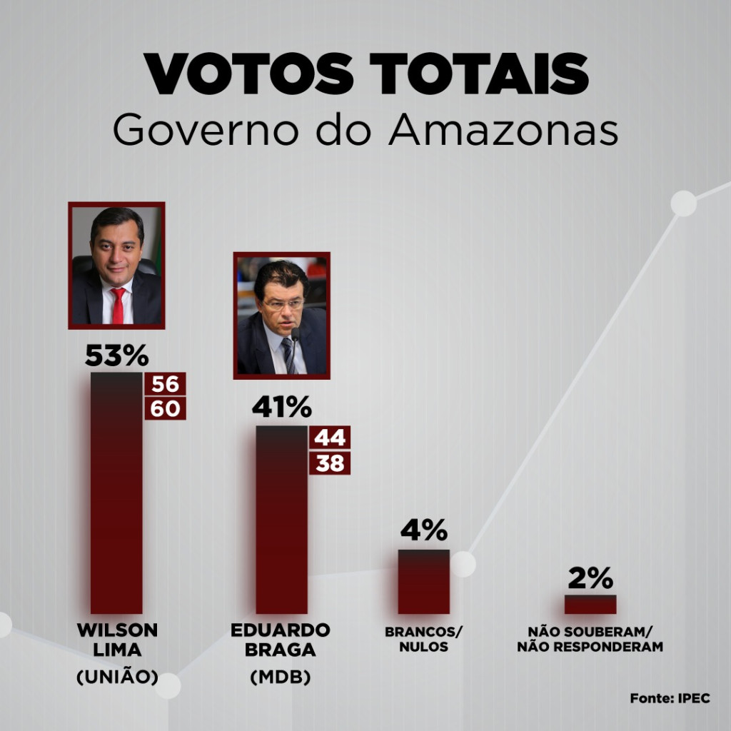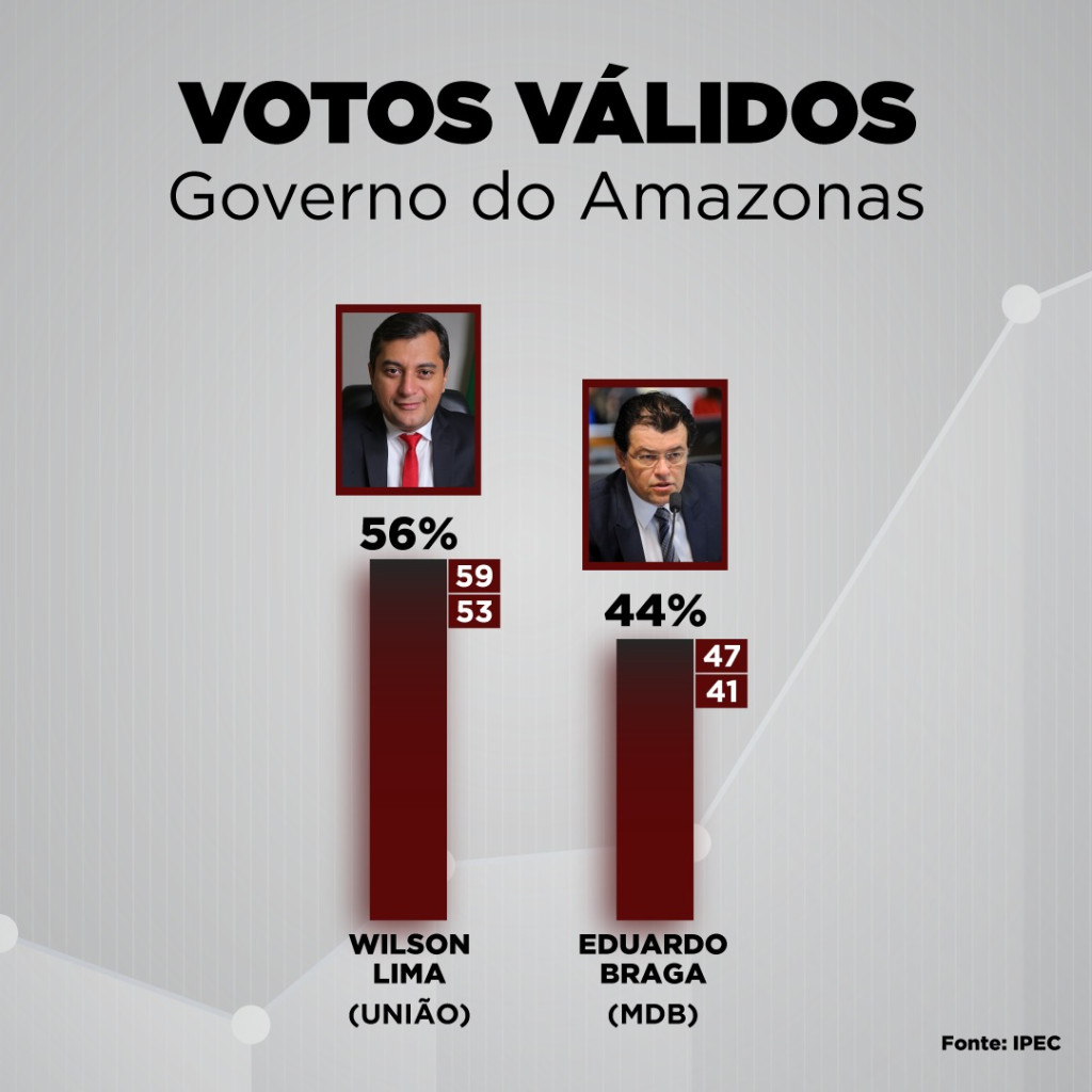 No estudo do Ipec (Inteligência em Pesquisa e Consultoria Estratégica) divulgado nesta quarta-feira, 19, o governador Wilson Lima abriu vantagem de 12 pontos a frente de Braga. O governador do Estado, que é apoiador da reeleição do presidente Jair Bolsonaro (PL), somou 56% dos votos válidos na pesquisa contra 44% do emedebista.