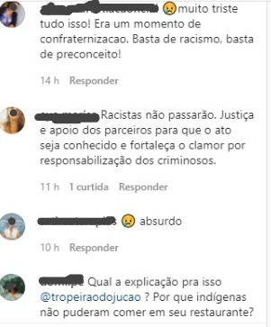 Ainda no Instagram, um homem pediu explicações do restaurante e questionou por que os indígenas não puderam comer no estabelecimento. “Qual a explicação pra isso @tropeiraodojucao? Por que indígenas não puderam comer em seu restaurante?”, indagou o homem, na rede social.