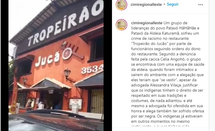 “De nada adiantou. Até mesmo a advogada foi ofendida em sua honra, que alega também ter sofrido ofensas por ser negra. Os indígenas já estiveram em outros momentos no mesmo restaurante e nunca foram agredidos”, relatou o conselho indigenista, em uma publicação no Instagram.