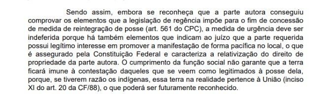 Na decisão dessa terça-feira, 5, o juiz Thales Leão afirma ainda que a determinação de retirada à força dos indígenas significaria que eles não teriam direito inerente ao local. No documento, o magistrado destaca que embora reconheça que os direitos dos fazendeiros, que conseguiram comprovar documentos de posse da terra, não desconsidera o argumento dos indígenas de que a propriedade fique em território ancestral.